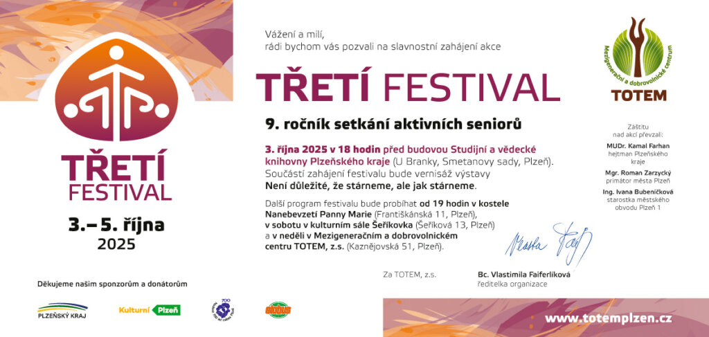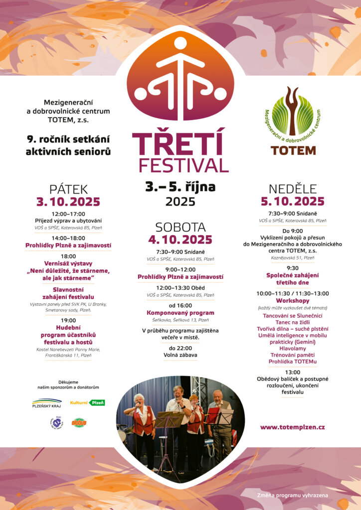 Další ročník Třetího festivalu – setkání aktivních seniorů – proběhne od pátku 3. října do neděle 5. října 2025 a jeho program bude opět pestrý – hudba, tanec, výstava, prohlídky plzeňské radnice a toho nejlepšího z Plzně, Loosových interiérů, pivovaru, Meditační zahrady a dalších zajímavých míst, workshopy, setkávání, sdílení společné radosti a inspirace.