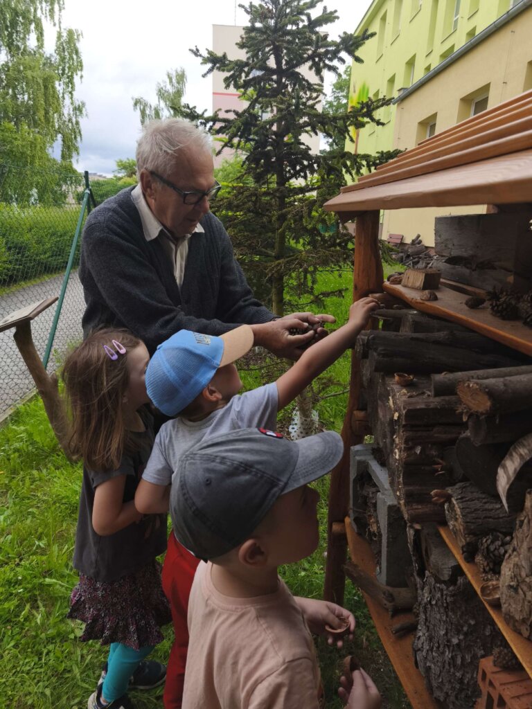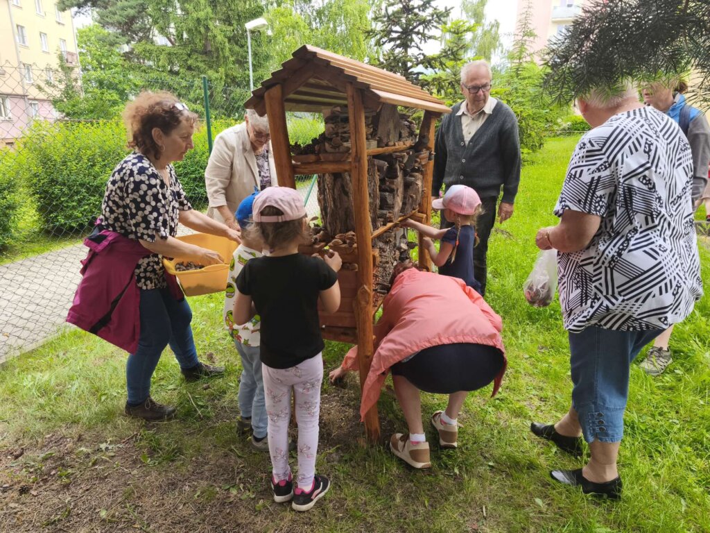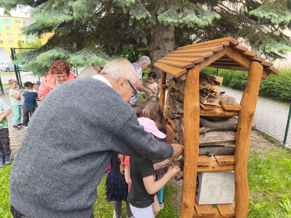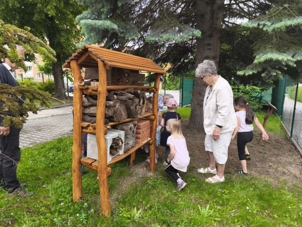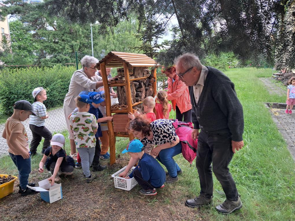 Děti, babičky a děda připravili na školkové zahradě domeček pro malé hmyzí návštěvníky. Moc se jim to povedlo a užili si hezký společný čas.