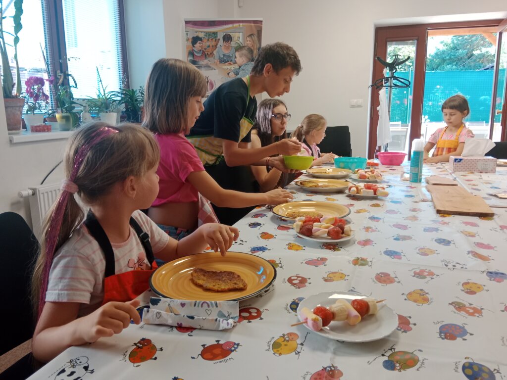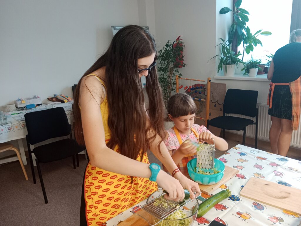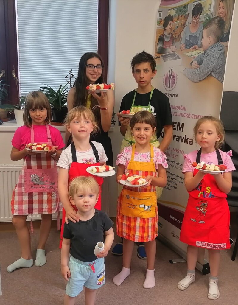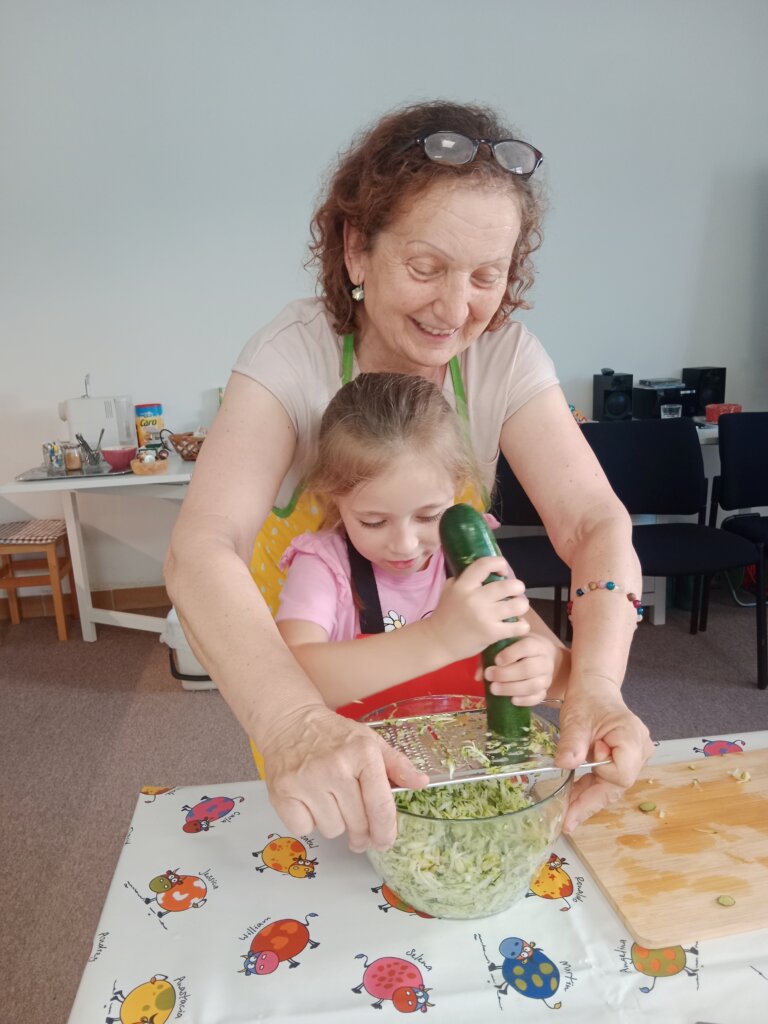 Na našem dalším „Vaření s babičkou“ si děti ukuchtily křupavé cuketové placičky (cuketová sezóna se blíží!) s jogurtovým dipem a osvěžující ovocné špízy. Děkujeme Lence Skopové a Věrce Geigerové!