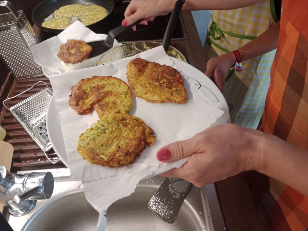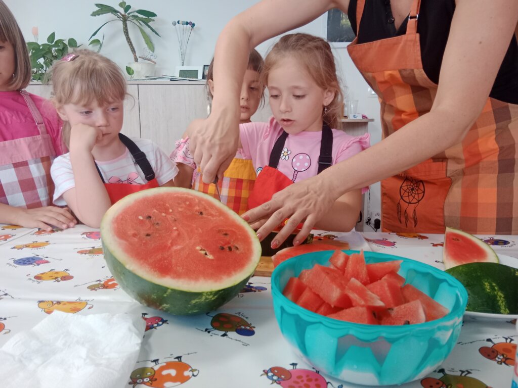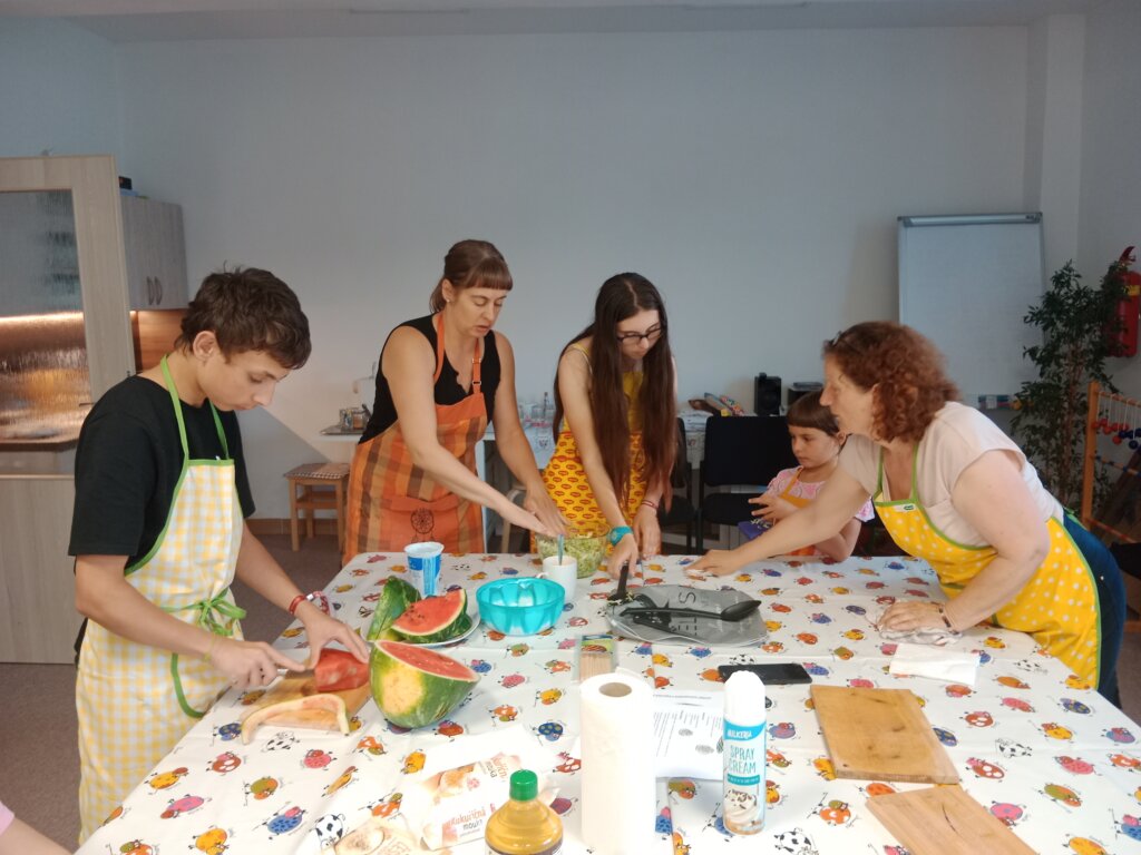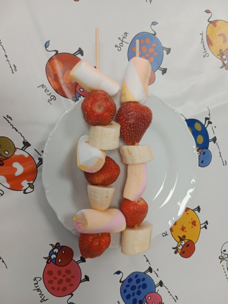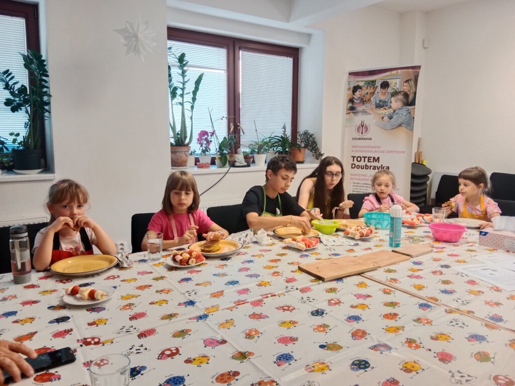 Na našem dalším „Vaření s babičkou“ si děti ukuchtily křupavé cuketové placičky (cuketová sezóna se blíží!) s jogurtovým dipem a osvěžující ovocné špízy. Děkujeme Lence Skopové a Věrce Geigerové!