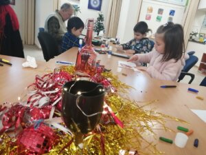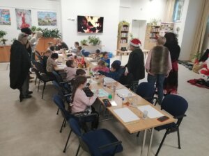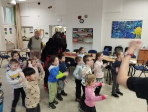 Společně s dětmi z mateřinky jsme tvořili tak pilně, až jsme se nakonec všichni krásně třpytili. Po tvoření přišla i pořádná porce zábavy a pobočkou se nesl dětský smích, dupot a nadšené výkřiky. Dorazili totiž naše skvělé čertice. Dobrovolníci se houpali v bocích a atmosféra byla naprosto báječná.